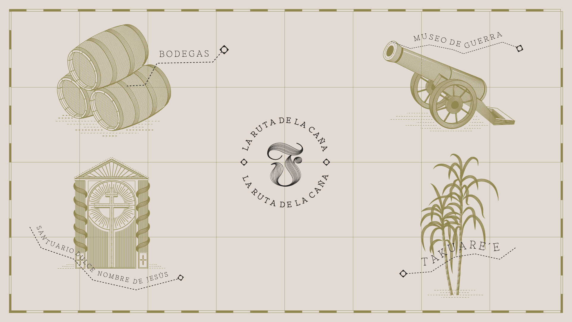 La Ruta de la Caña es un tour turístico de Fortín en la ciudad de Piribebuy, que consta de un recorrido sensorial por la historia del ron paraguayo, haciendo varias paradas relevantes para su proceso de elaboración.◇Tomamos el trayecto exacto de esta travesía y lo convertimos en la base de una nueva identidad, con un ecosistema visual que se adapta a cada uno de los caminos recorridos en el tour.