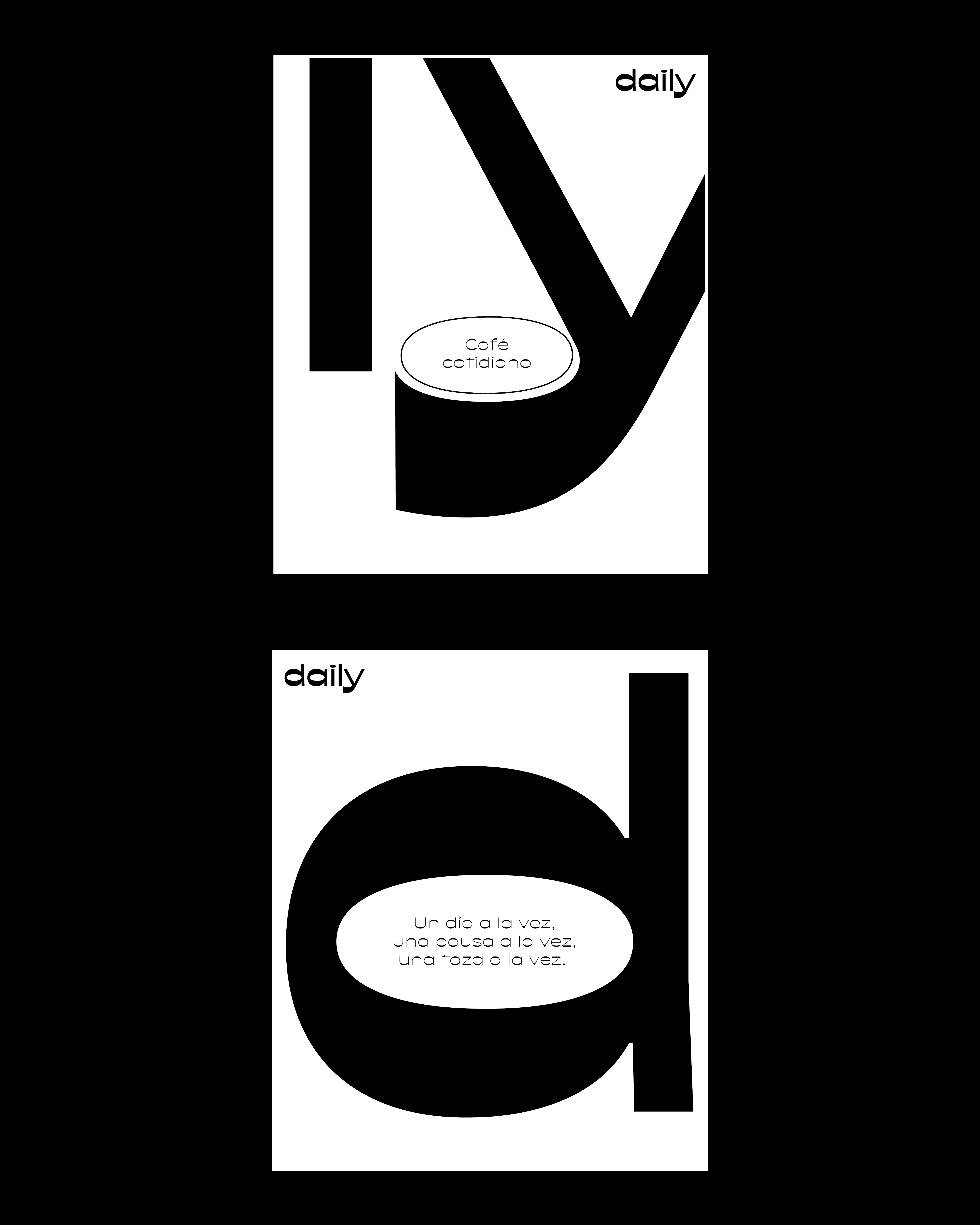 Cada día es una historia, un instante, un ritual. Su esencia está en lo simple, en lo auténtico, en esos pequeños detalles que transforman lo ordinario en extraordinario. Porque en cada sorbo hay inspiración, en cada taza hay un propósito. Utilicé la forma del grano de café como base para la identidad de Daily, integrándola de manera sutil en la tipografía. Aprovechando de la manera más simple y delicada los espacios donde la forma coexiste.
