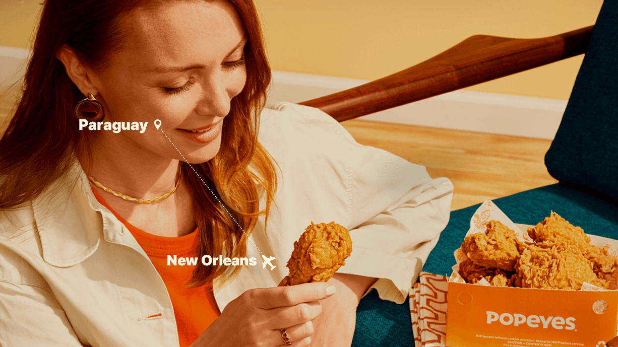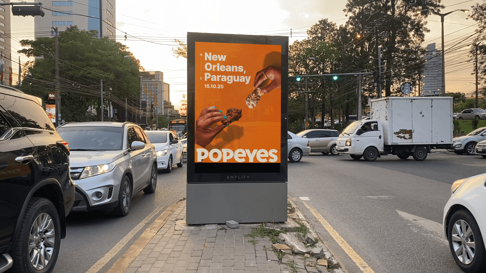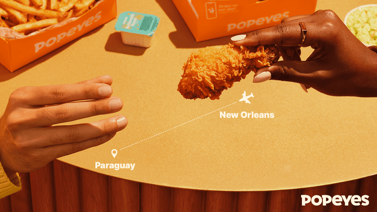 Popeyes llegaba a Paraguay y todo lo que había que decir era que los auténticos pollos fritos de New Orleans estaban aterrizando. El desafío parecía táctico, pero la solución fue simple y poderosa: un gesto universal que todos entendemos, casi inconsciente, donde la comida se comparte y se conecta. Convertimos ese instante en una narrativa visual en donde el pollo “viaja” de origen a destino, de mano en mano o en un avión imaginario, sin palabras, sin sobreexplicaciones.